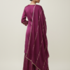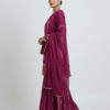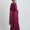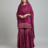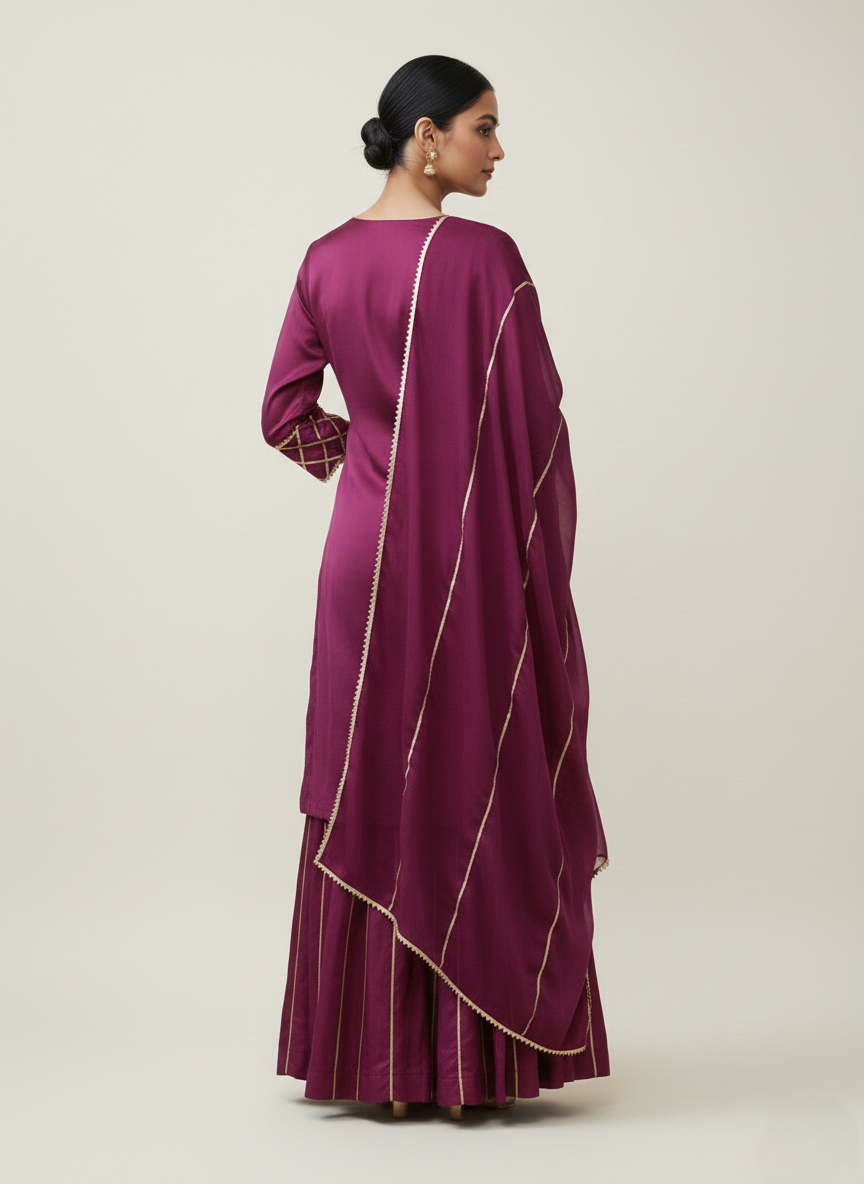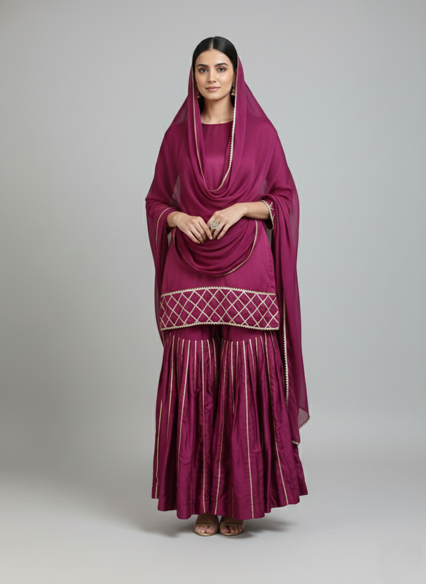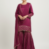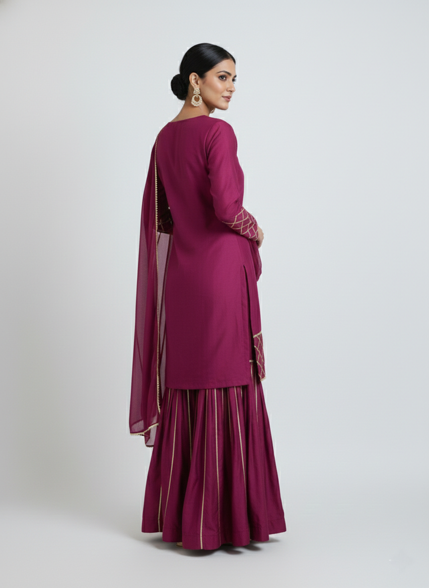 A deep wine kurta paired with flowy sharara pants and a matching dupatta, finished with delicate gold grid detailing for a refined festive look.